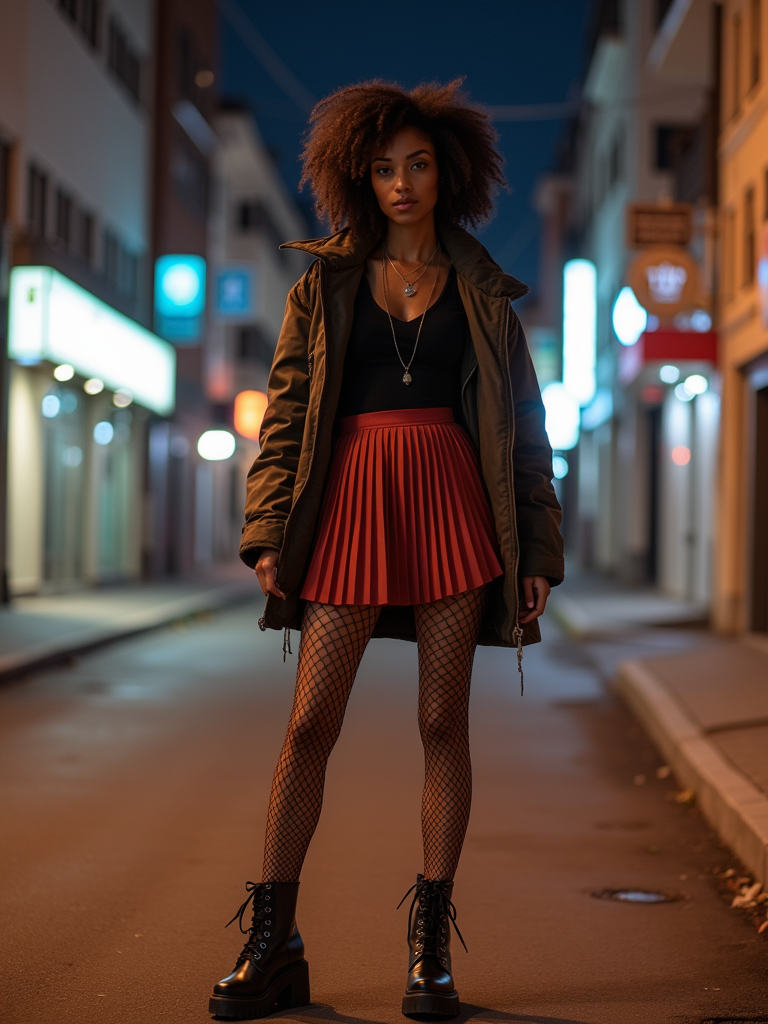 Model in an E-Girl streetwear fashion shoot. Fishnet stockings, pleated skirt, chunky boots . Urban background, city lights.