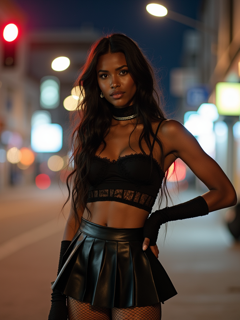Model in an E-Girl streetwear fashion shoot. Fishnet stockings, pleated skirt, chunky boots . Urban background, city lights.