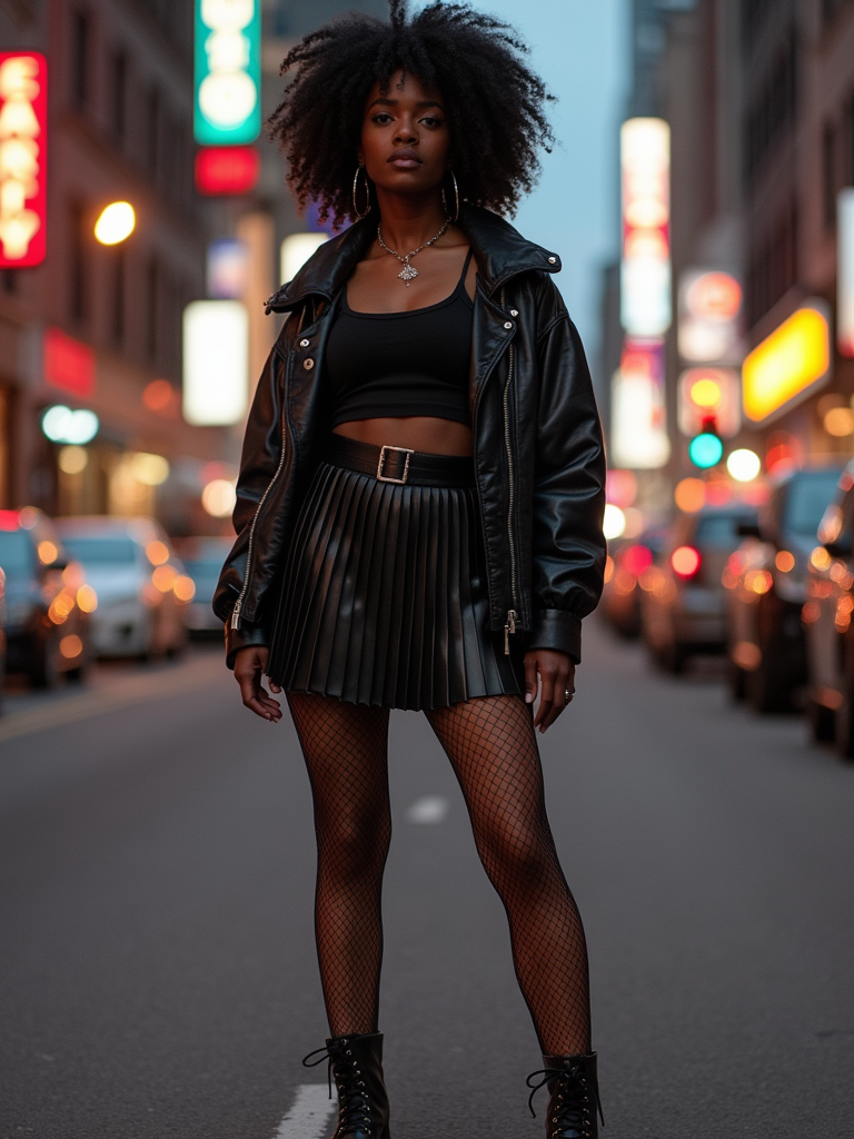 Model in an E-Girl streetwear fashion shoot. Fishnet stockings, pleated skirt, chunky boots . Urban background, city lights.