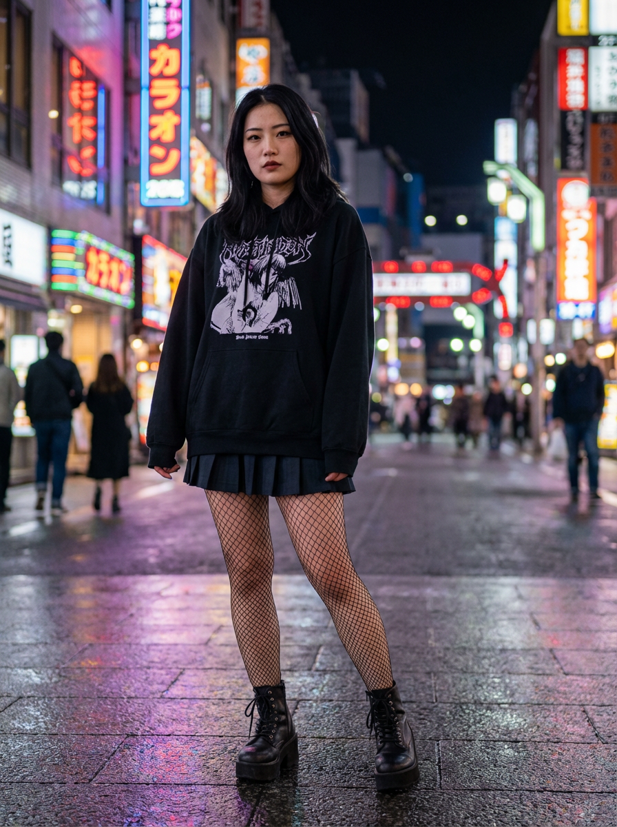 Model in an E-Girl streetwear fashion shoot. Fishnet stockings, pleated skirt, chunky boots . Urban background, city lights.