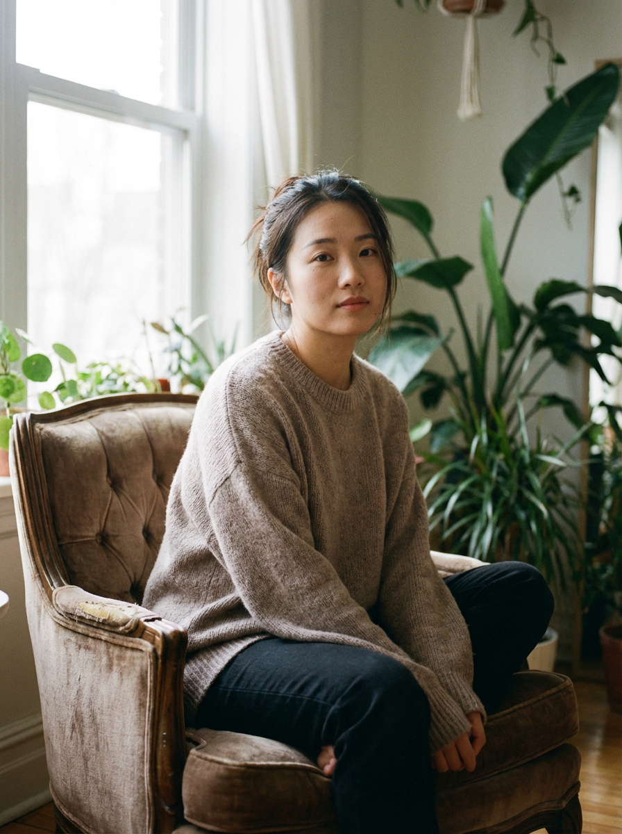 Model in an intimate environmental portrait. Alluring pose, soft natural lighting . Documentary style photography.