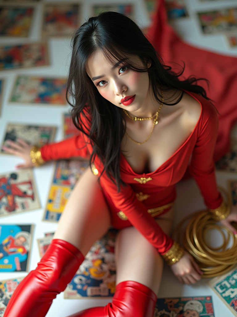 Model in vibrant, high-detail superhero costume, laying seductively on a pristine white floor covered in a chaotic spread of colorful vintage comic books. Red thigh-high boots and a golden lasso loosely wrapped around her body enhance the look. Her playful, knowing gaze directly at the camera adds a flirtatious charm. Bright, soft lighting enhances the vivid colors and creates a dynamic, energetic feel.