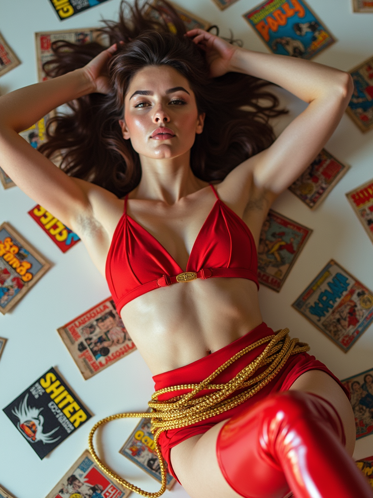Model in vibrant, high-detail superhero costume, laying seductively on a pristine white floor covered in a chaotic spread of colorful vintage comic books. Red thigh-high boots and a golden lasso loosely wrapped around her body enhance the look. Her playful, knowing gaze directly at the camera adds a flirtatious charm. Bright, soft lighting enhances the vivid colors and creates a dynamic, energetic feel.