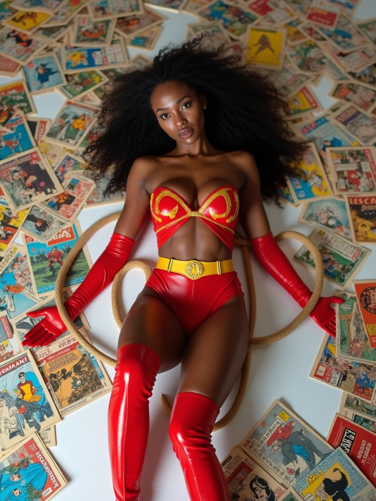 Model in vibrant, high-detail superhero costume, laying seductively on a pristine white floor covered in a chaotic spread of colorful vintage comic books. Red thigh-high boots and a golden lasso loosely wrapped around her body enhance the look. Her playful, knowing gaze directly at the camera adds a flirtatious charm. Bright, soft lighting enhances the vivid colors and creates a dynamic, energetic feel.