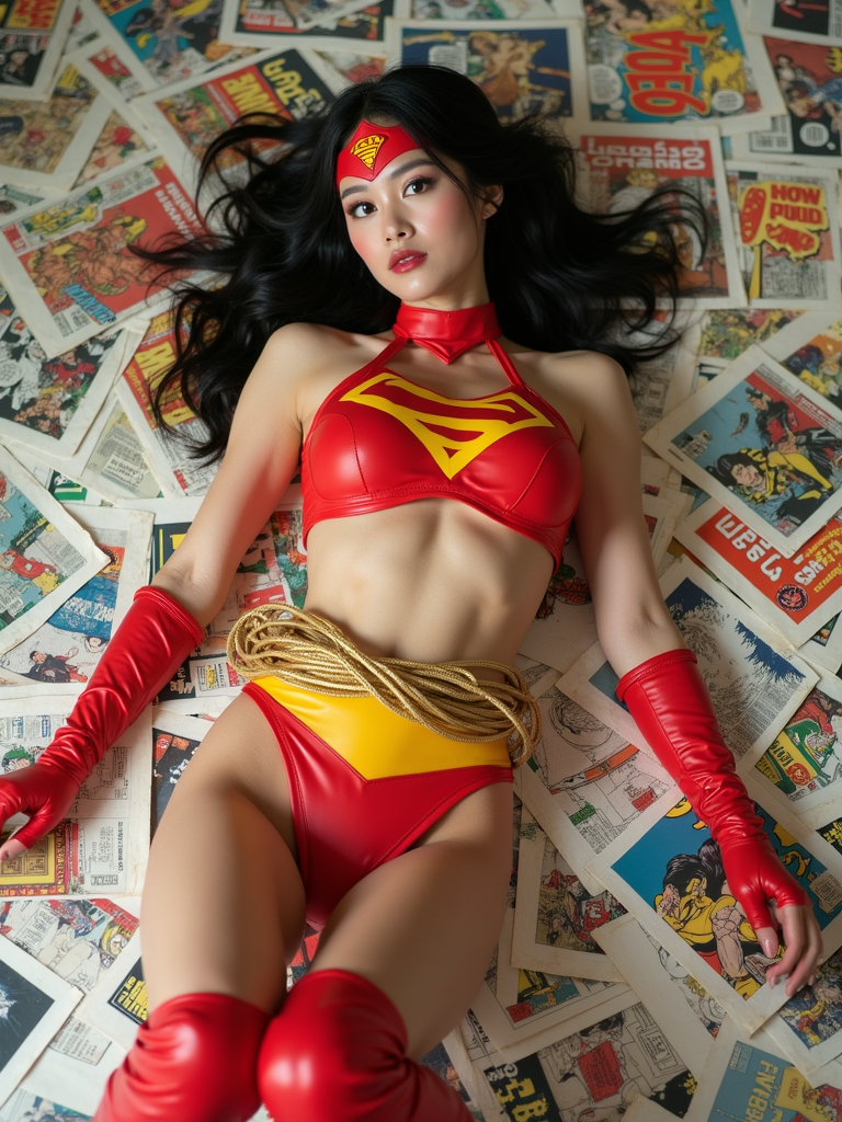 Model in vibrant, high-detail superhero costume, laying seductively on a pristine white floor covered in a chaotic spread of colorful vintage comic books. Red thigh-high boots and a golden lasso loosely wrapped around her body enhance the look. Her playful, knowing gaze directly at the camera adds a flirtatious charm. Bright, soft lighting enhances the vivid colors and creates a dynamic, energetic feel.