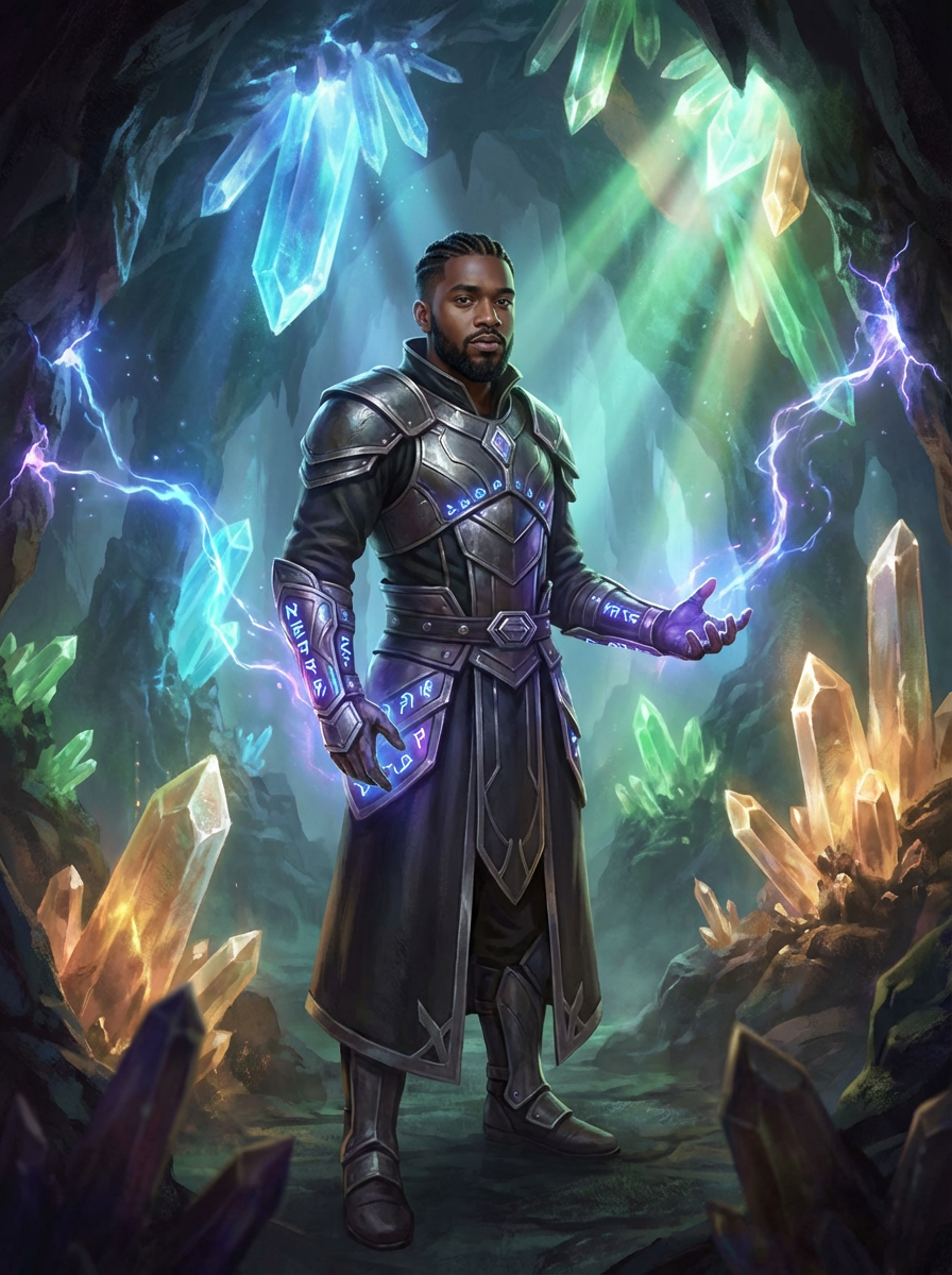 Model inside a glowing crystal cave, energy pulsing from the walls. Wearing armored robes with enchanted gauntlets. High-fantasy tone, rich color palette, underground magic.