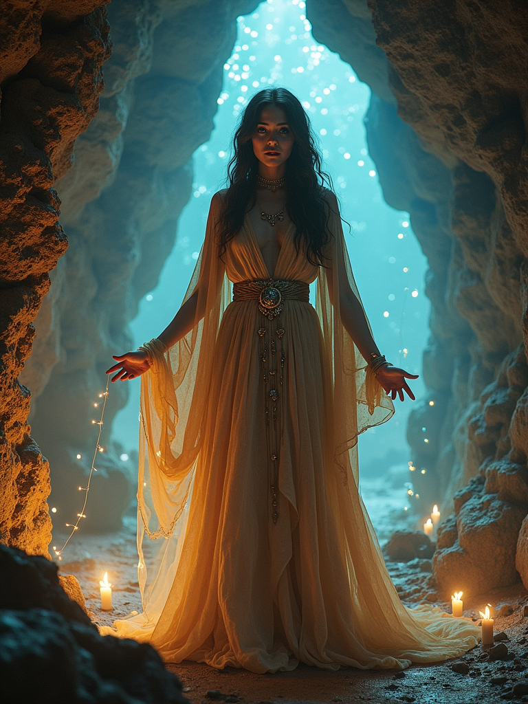 Model inside a glowing crystal cave, energy pulsing from the walls. Wearing magical robes with floating ornaments . High-fantasy tone, rich color palette, underground magic.