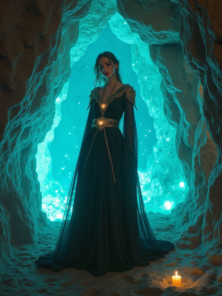 Model inside a glowing crystal cave, energy pulsing from the walls. Wearing magical robes with floating ornaments . High-fantasy tone, rich color palette, underground magic.