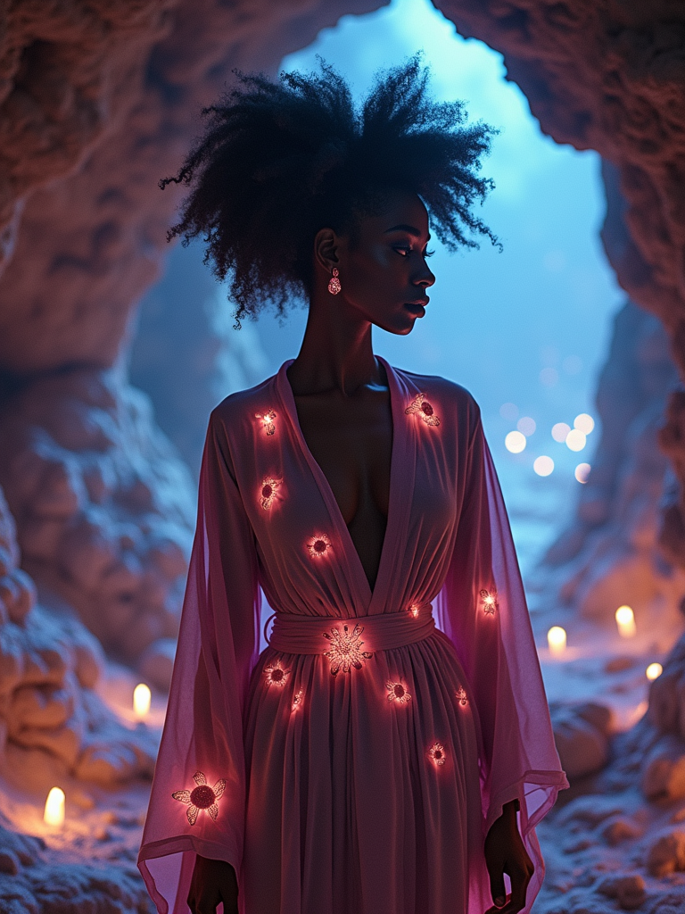 Model inside a glowing crystal cave, energy pulsing from the walls. Wearing magical robes with floating ornaments . High-fantasy tone, rich color palette, underground magic.