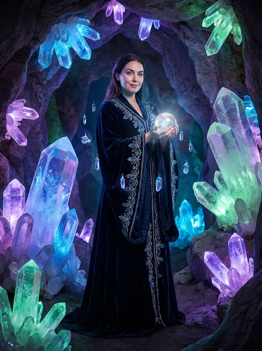 Model inside a glowing crystal cave, energy pulsing from the walls. Wearing magical robes with floating ornaments . High-fantasy tone, rich color palette, underground magic.