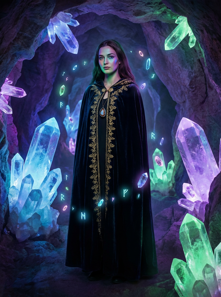 Model inside a glowing crystal cave, energy pulsing from the walls. Wearing magical robes with floating ornaments . High-fantasy tone, rich color palette, underground magic.