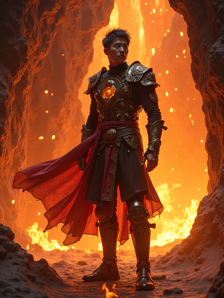 Model inside a magical lava cave surrounded by glowing crystals and firelight. Wearing enchanted leather armor with glowing glyphs. Fantasy RPG style, molten rock, ritual atmosphere.