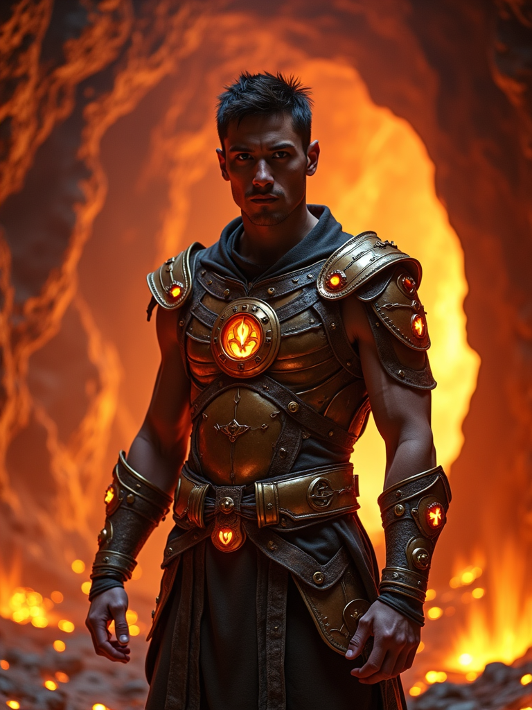 Model inside a magical lava cave surrounded by glowing crystals and firelight. Wearing enchanted leather armor with glowing glyphs. Fantasy RPG style, molten rock, ritual atmosphere.