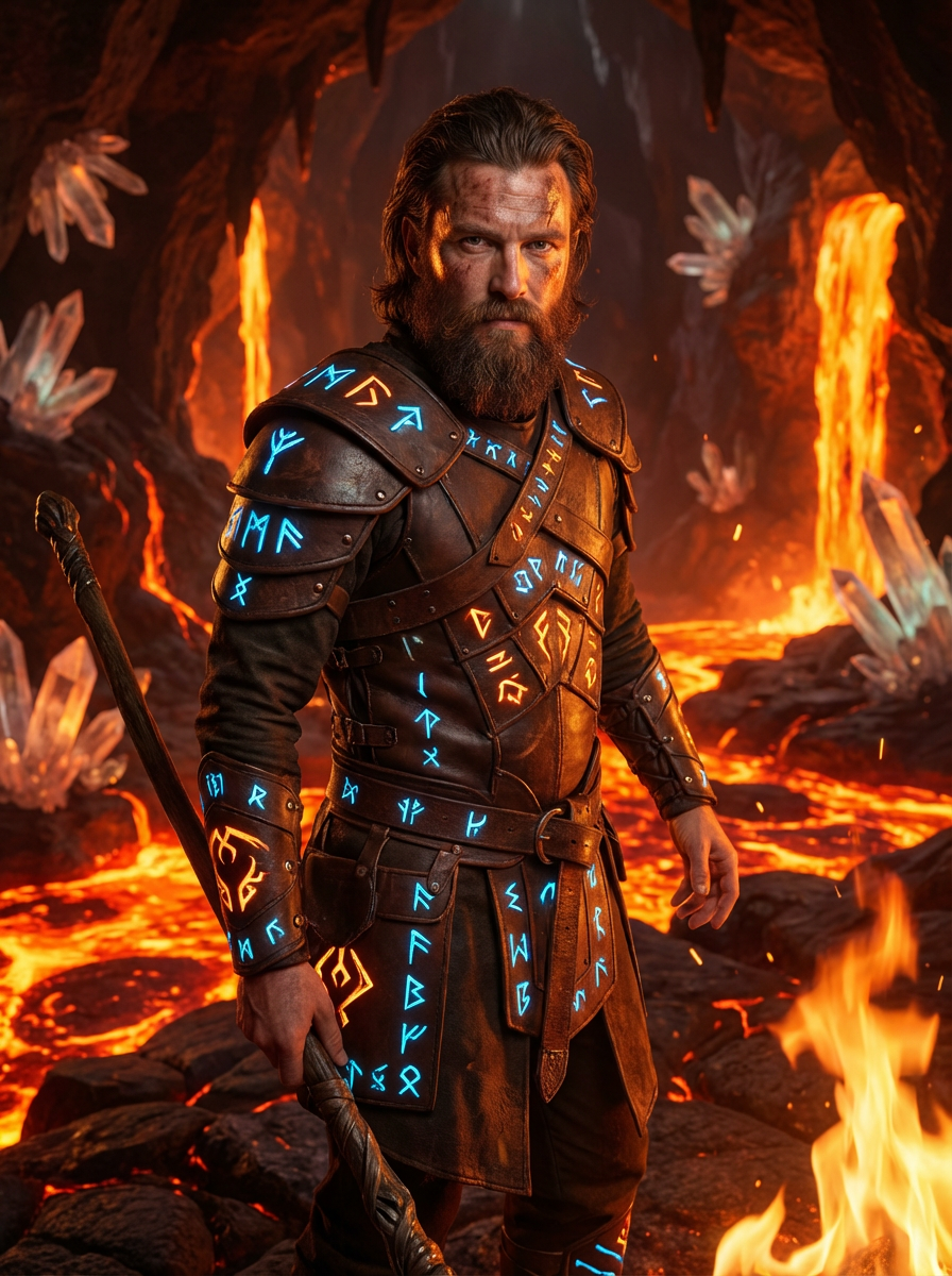 Model inside a magical lava cave surrounded by glowing crystals and firelight. Wearing enchanted leather armor with glowing glyphs. Fantasy RPG style, molten rock, ritual atmosphere.