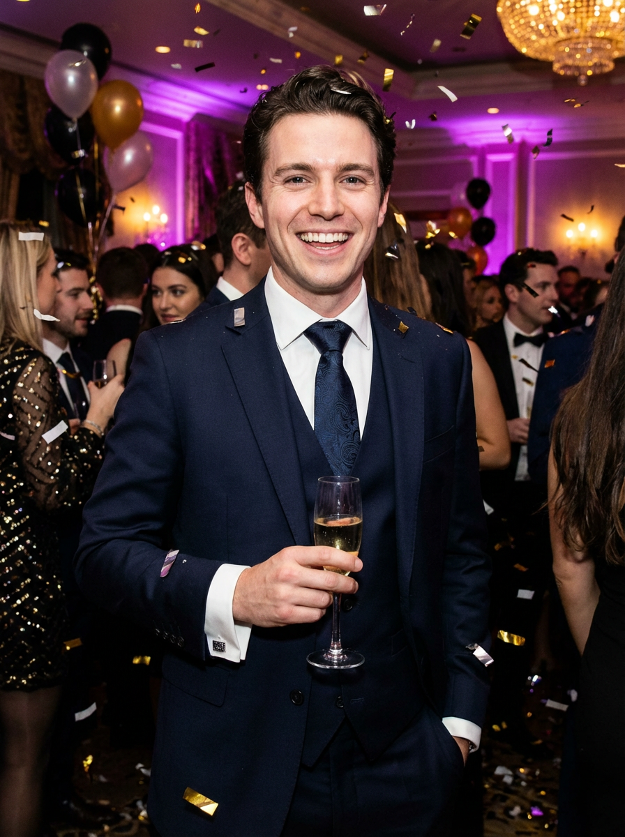 Model posing smiling, wearing a classy three-piece suit with a patterned tie and cufflinks. Surrounded by champagne glasses and confetti in a luxurious New Year's Eve party setting. Vibrant lighting.