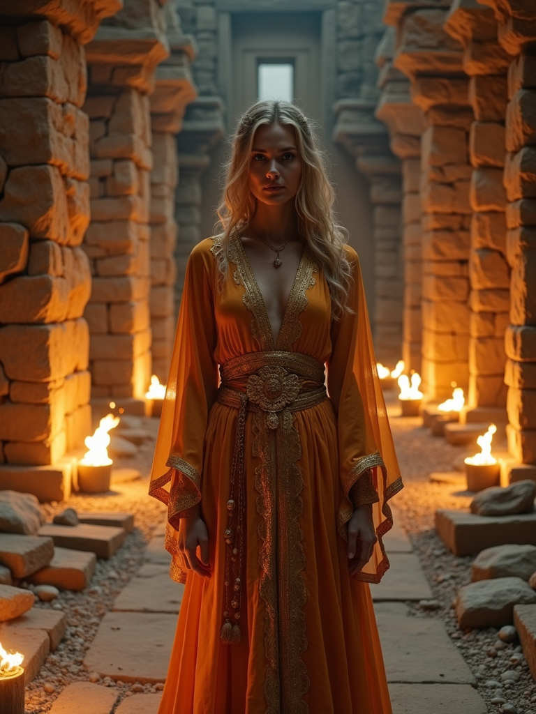 Model positioned inside a ruined stone temple lit by torches. Wearing elegant ceremonial robe with gold details . Ancient architecture, warm glow, fantasy ruin atmosphere.