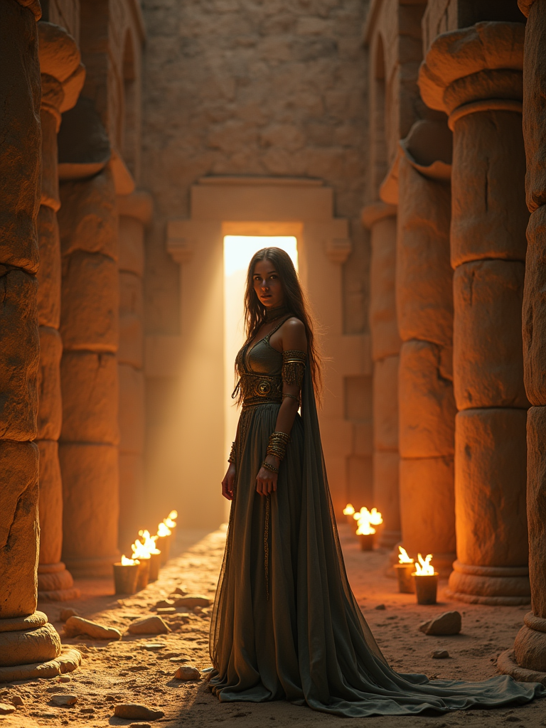 Model positioned inside a ruined stone temple lit by torches. Wearing elegant ceremonial robe with gold details . Ancient architecture, warm glow, fantasy ruin atmosphere.