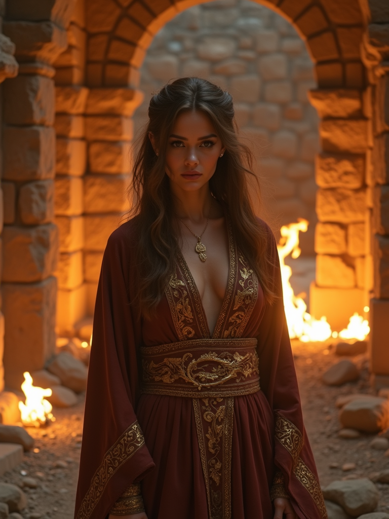 Model positioned inside a ruined stone temple lit by torches. Wearing elegant ceremonial robe with gold details . Ancient architecture, warm glow, fantasy ruin atmosphere.