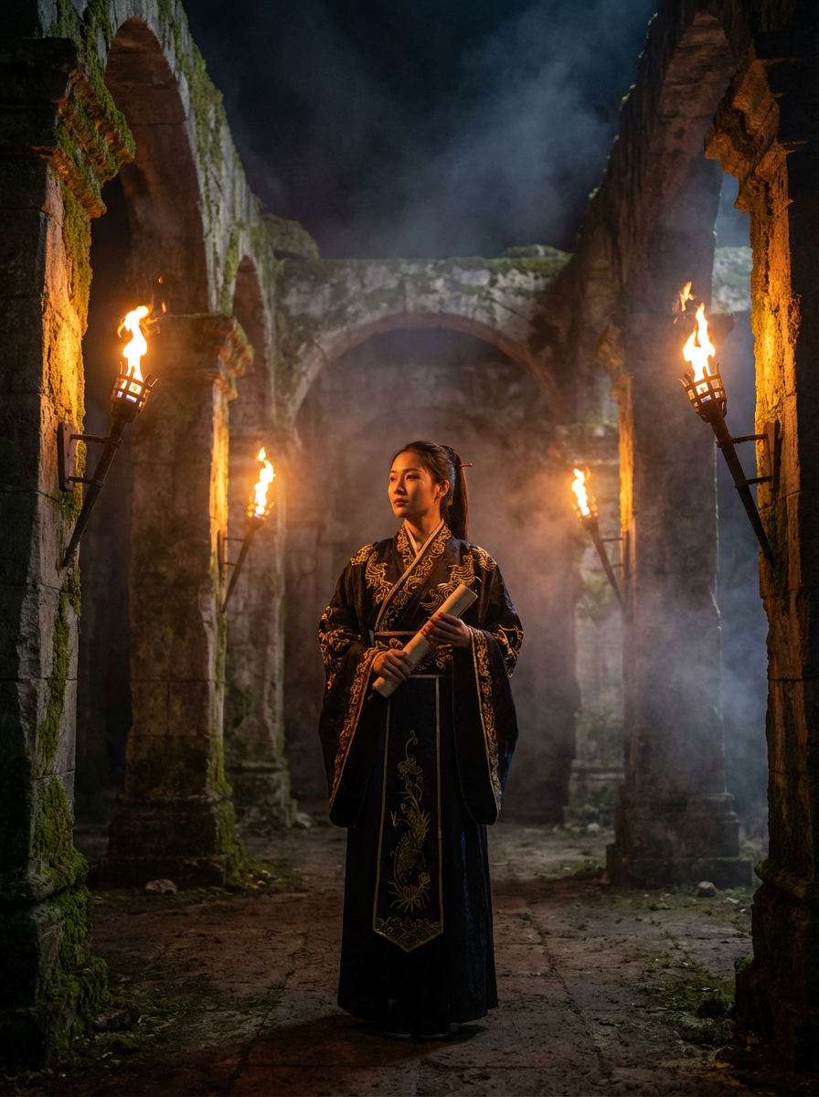 Model positioned inside a ruined stone temple lit by torches. Wearing elegant ceremonial robe with gold details . Ancient architecture, warm glow, fantasy ruin atmosphere.