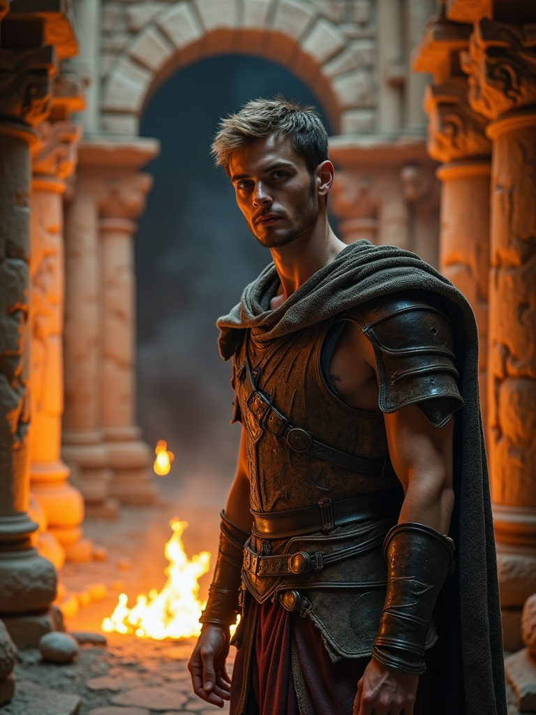 Model positioned inside a ruined stone temple lit by torches. Wearing rugged battle tunic and weathered armor. Ancient architecture, warm glow, fantasy ruin atmosphere.