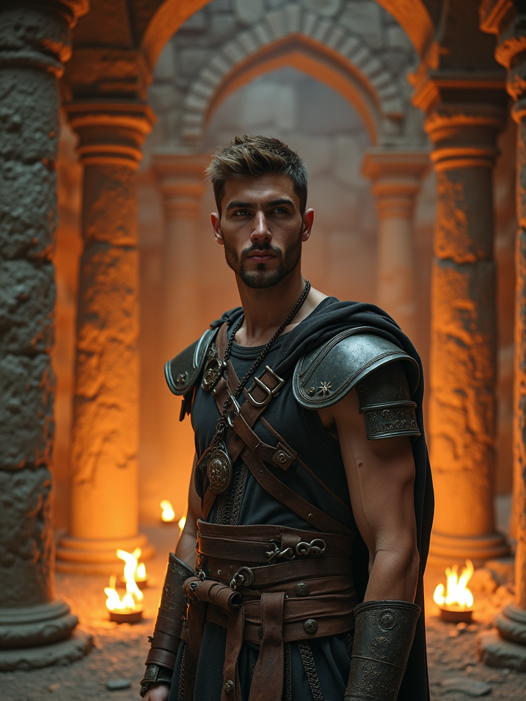 Model positioned inside a ruined stone temple lit by torches. Wearing rugged battle tunic and weathered armor. Ancient architecture, warm glow, fantasy ruin atmosphere.