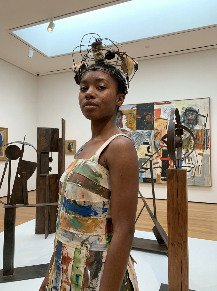Model reimagined as a modern art portrait. Contemporary style, artistic elements . Museum exhibition quality.