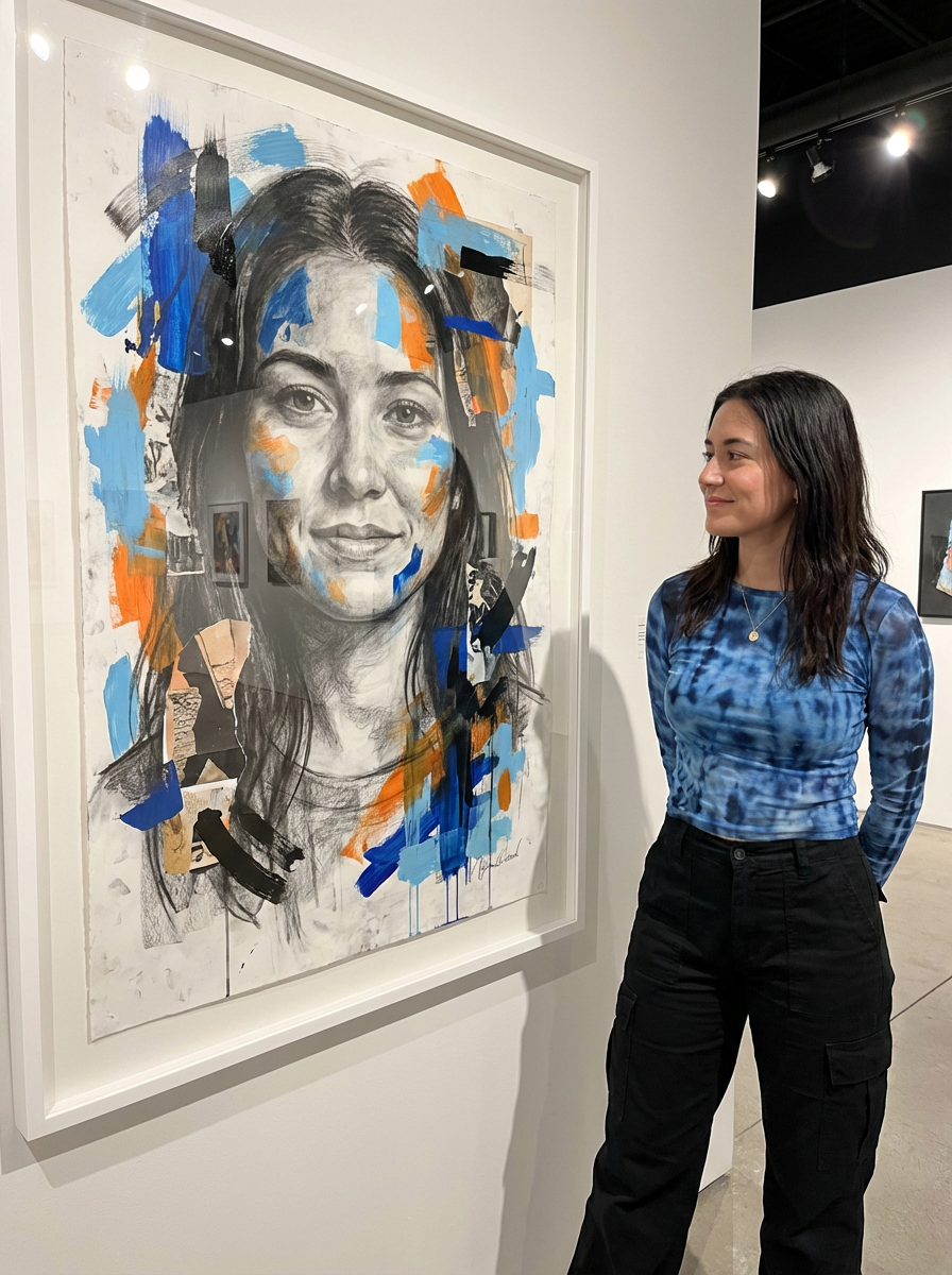 Model reimagined as a modern art portrait. Contemporary style, artistic elements . Museum exhibition quality.