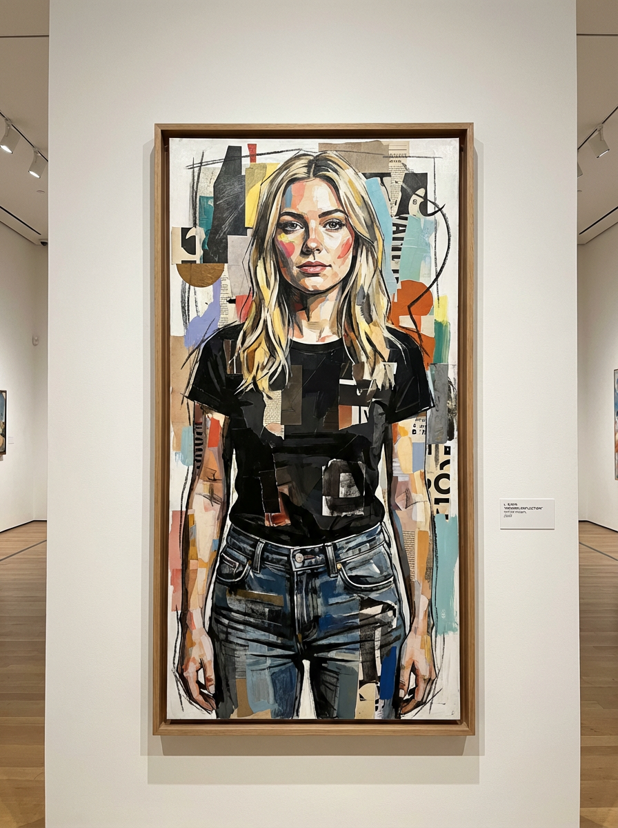 Model reimagined as a modern art portrait. Contemporary style, artistic elements . Museum exhibition quality.