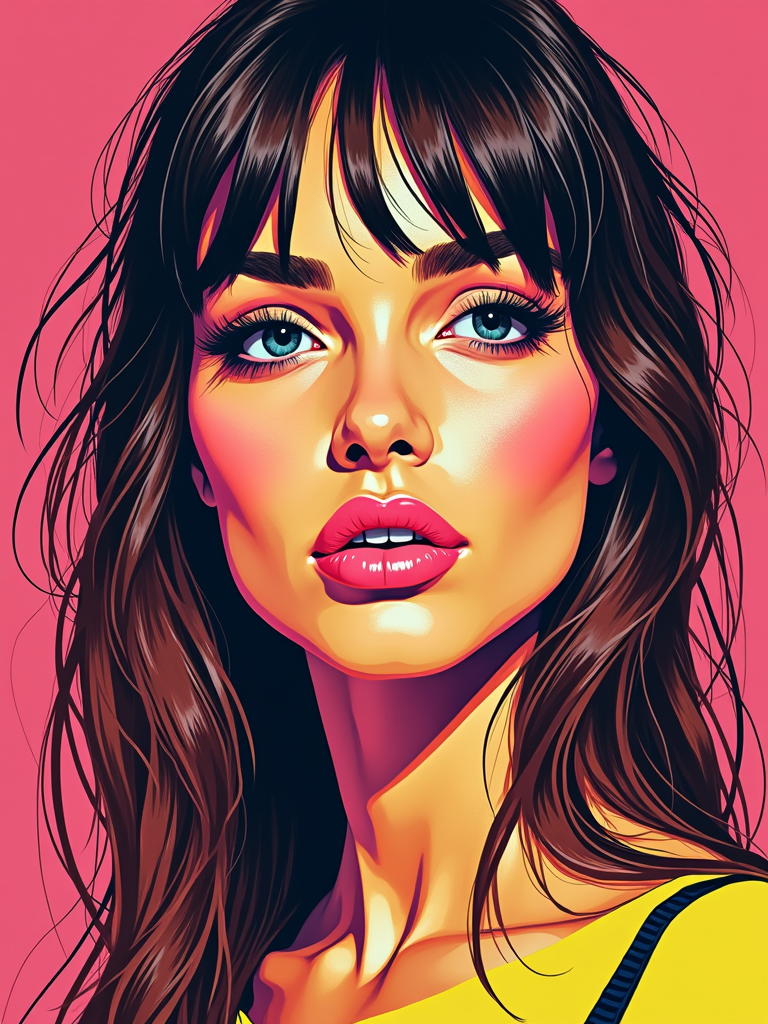 Model reimagined as a pop art portrait. Bold colors, graphic style . Andy Warhol inspired, vibrant palette.