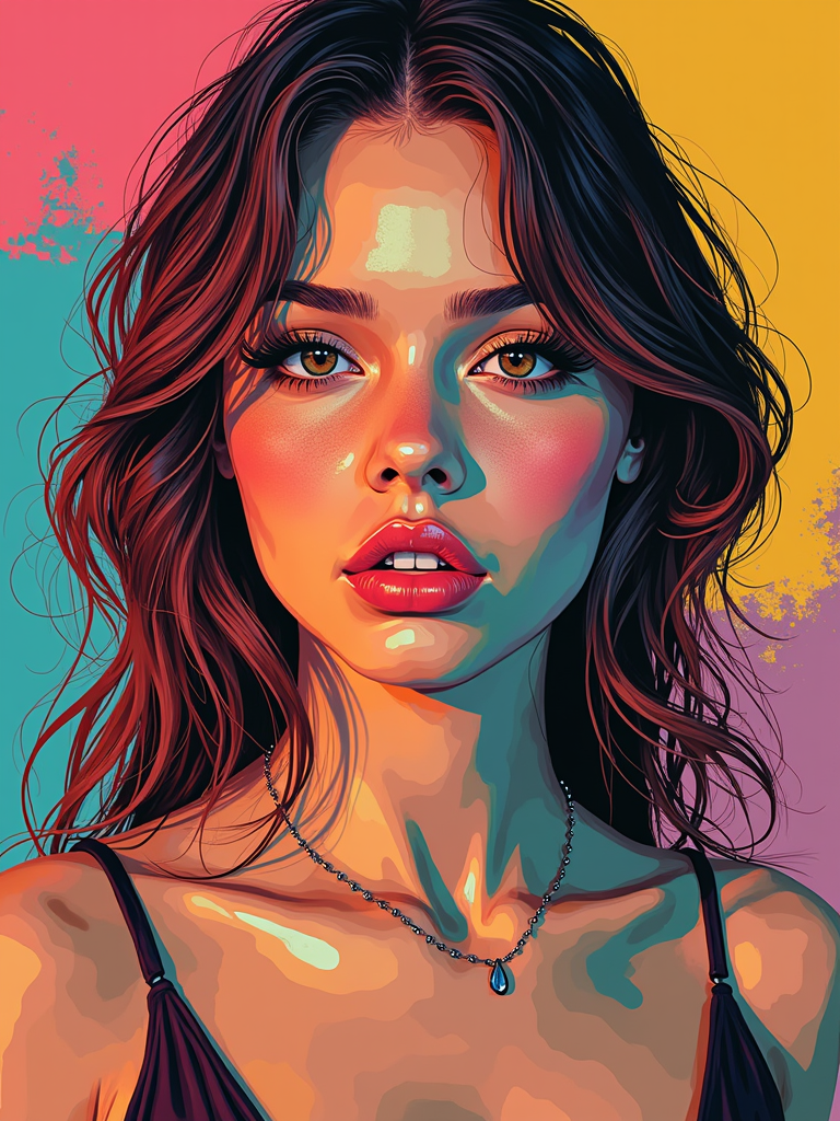 Model reimagined as a pop art portrait. Bold colors, graphic style . Andy Warhol inspired, vibrant palette.