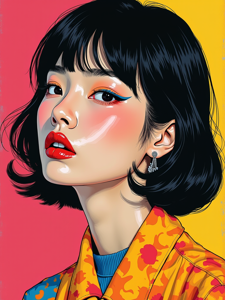 Model reimagined as a pop art portrait. Bold colors, graphic style . Andy Warhol inspired, vibrant palette.