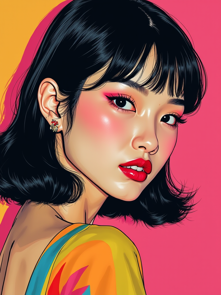 Model reimagined as a pop art portrait. Bold colors, graphic style . Andy Warhol inspired, vibrant palette.