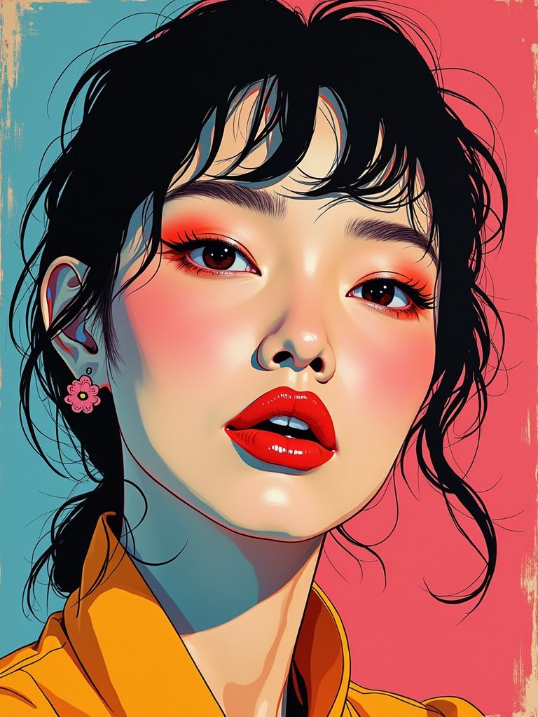 Model reimagined as a pop art portrait. Bold colors, graphic style . Andy Warhol inspired, vibrant palette.
