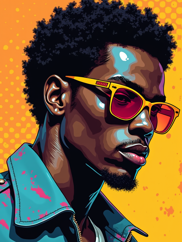 Model reimagined as a pop art portrait. Strong lines, comic book aesthetic. Andy Warhol inspired, vibrant palette.