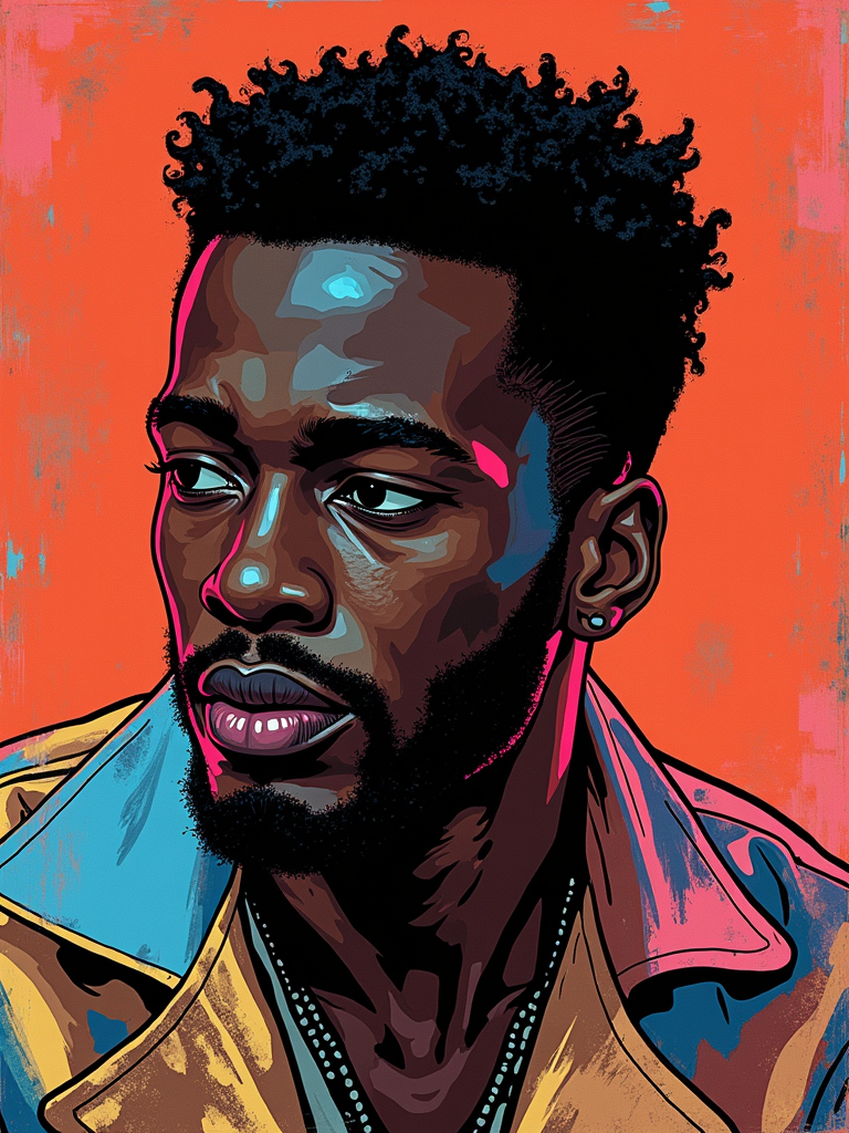 Model reimagined as a pop art portrait. Strong lines, comic book aesthetic. Andy Warhol inspired, vibrant palette.