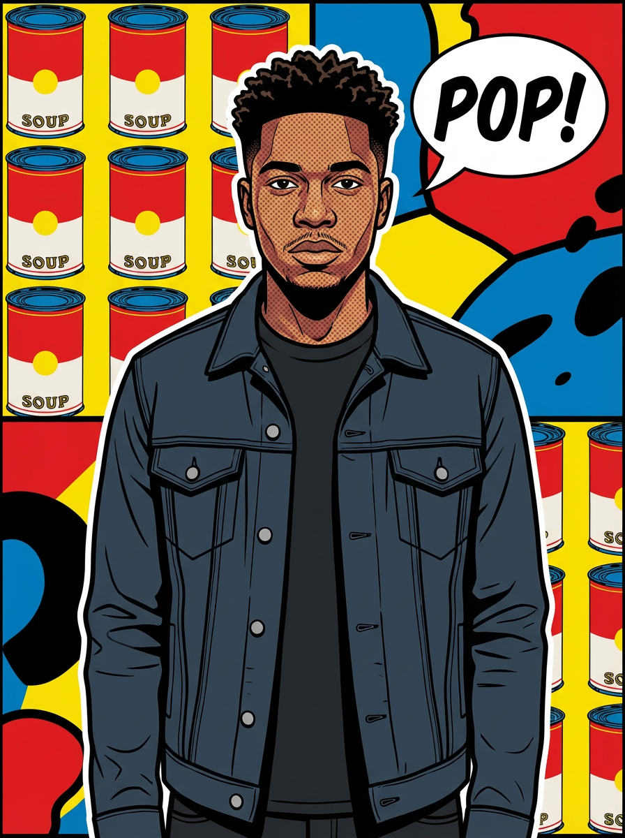 Model reimagined as a pop art portrait. Strong lines, comic book aesthetic. Andy Warhol inspired, vibrant palette.