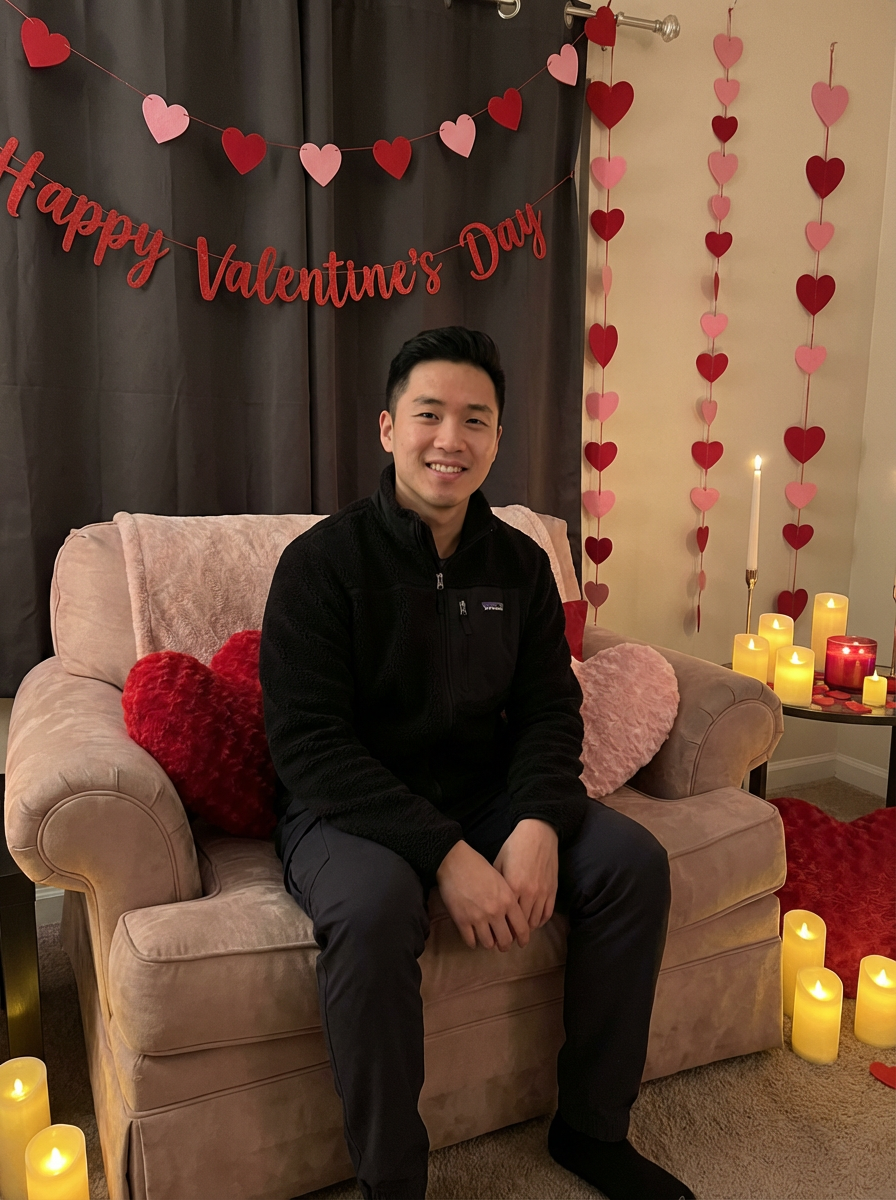 Model sitting in a cozy setting, surrounded by heart decorations and candles for a Valentine's-themed photo.