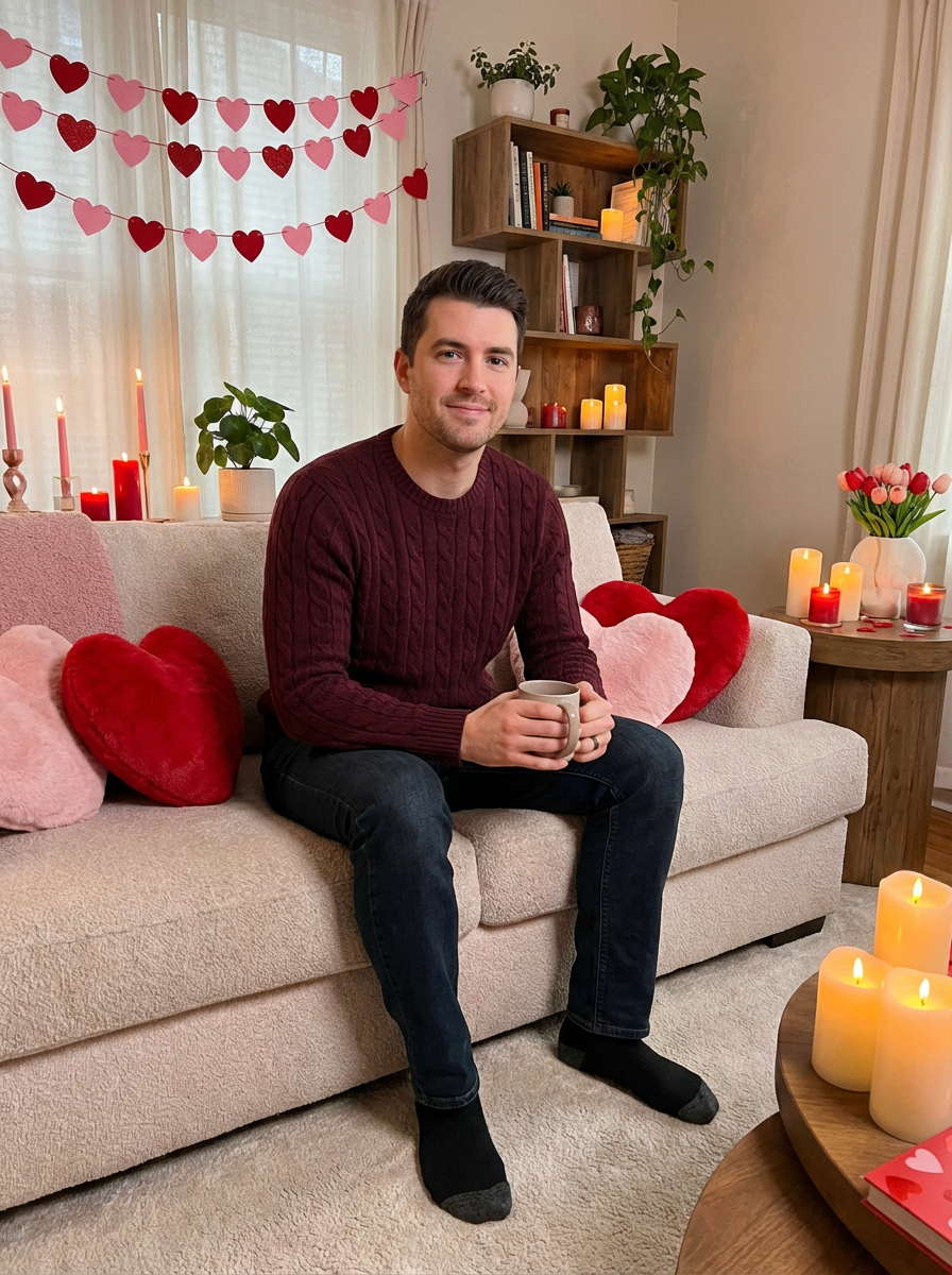 Model sitting in a cozy setting, surrounded by heart decorations and candles for a Valentine's-themed photo.