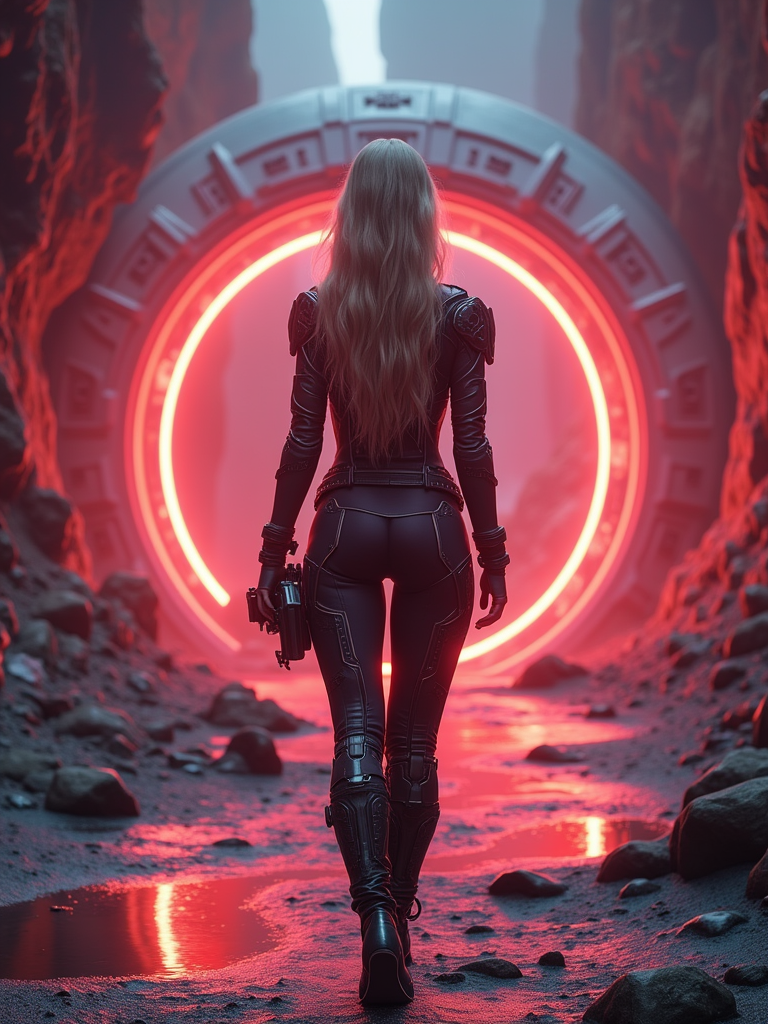 Model standing at the entrance of a glowing alien reactor base. Wearing a sleek tactical bodysuit with neon accents . Sci-fi terrain, cinematic lighting, ultra-detailed tech base, 3D render style.