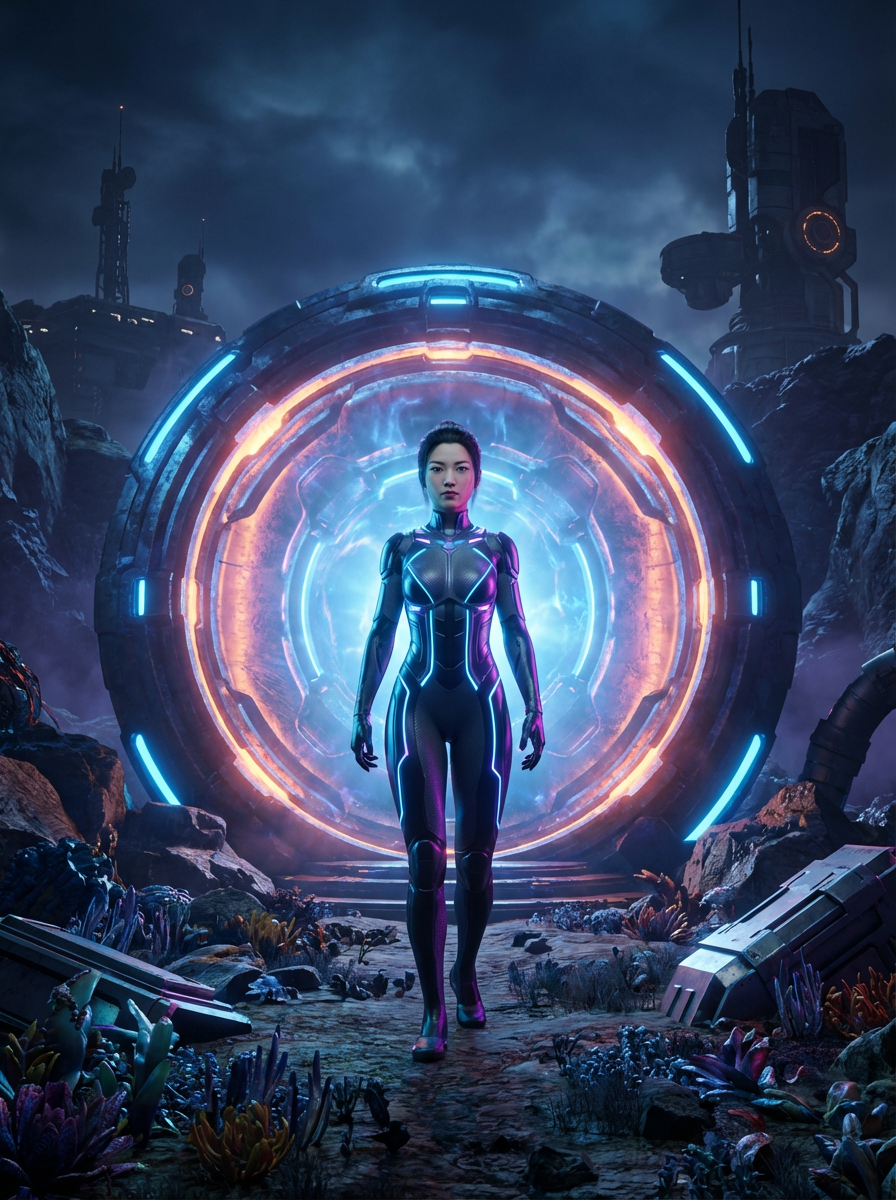 Model standing at the entrance of a glowing alien reactor base. Wearing a sleek tactical bodysuit with neon accents . Sci-fi terrain, cinematic lighting, ultra-detailed tech base, 3D render style.