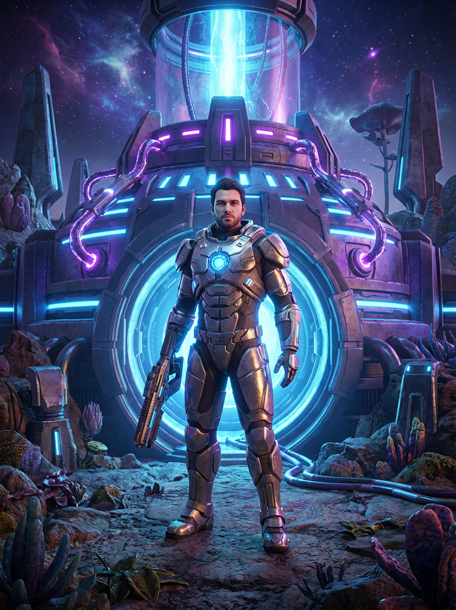 Model standing at the entrance of a glowing alien reactor base. Wearing an armored exo-suit with glowing core. Sci-fi terrain, cinematic lighting, ultra-detailed tech base, 3D render style.