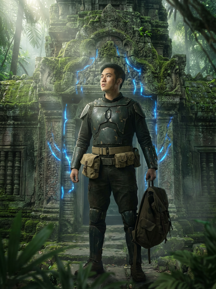 Model standing before an ancient jungle temple glowing with blue energy. Wearing rugged survival armor with utility belt. Overgrown ruins, tropical light shafts, mystical vibe.