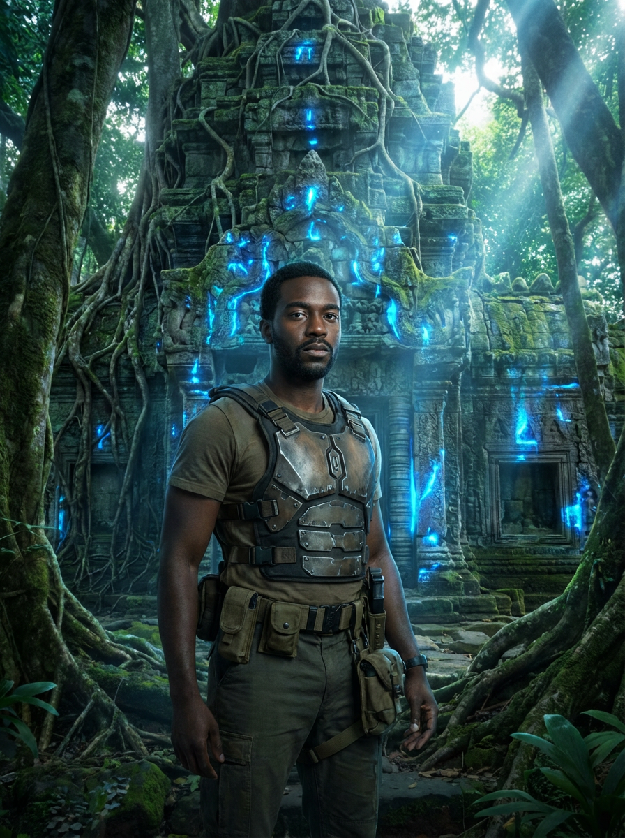 Model standing before an ancient jungle temple glowing with blue energy. Wearing rugged survival armor with utility belt. Overgrown ruins, tropical light shafts, mystical vibe.