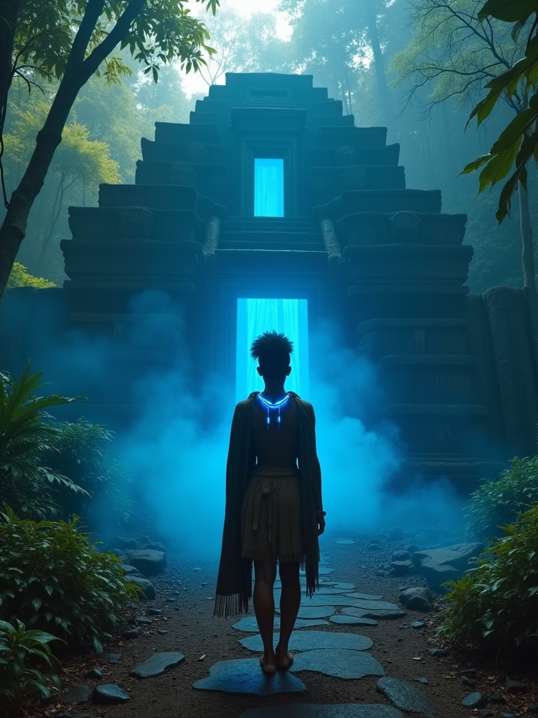 Model standing before an ancient jungle temple glowing with blue energy. Wearing tribal explorer gear, short cloak, glowing necklace . Overgrown ruins, tropical light shafts, mystical vibe.