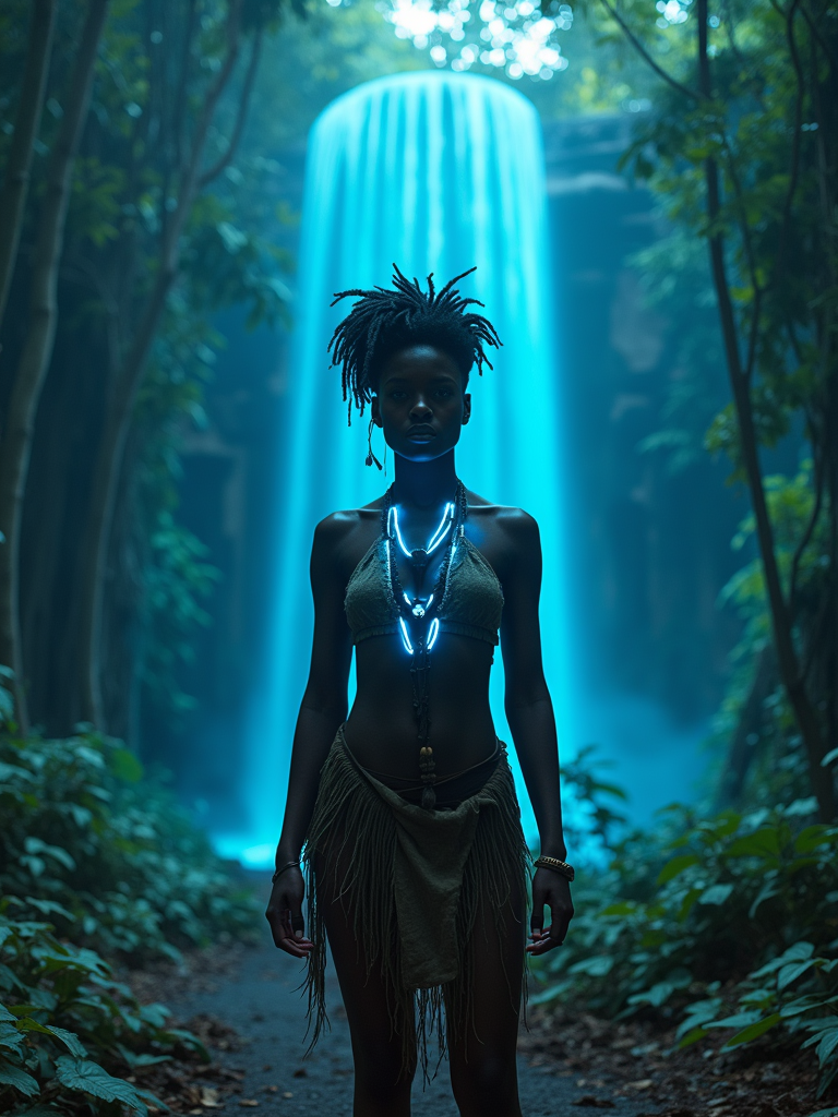 Model standing before an ancient jungle temple glowing with blue energy. Wearing tribal explorer gear, short cloak, glowing necklace . Overgrown ruins, tropical light shafts, mystical vibe.