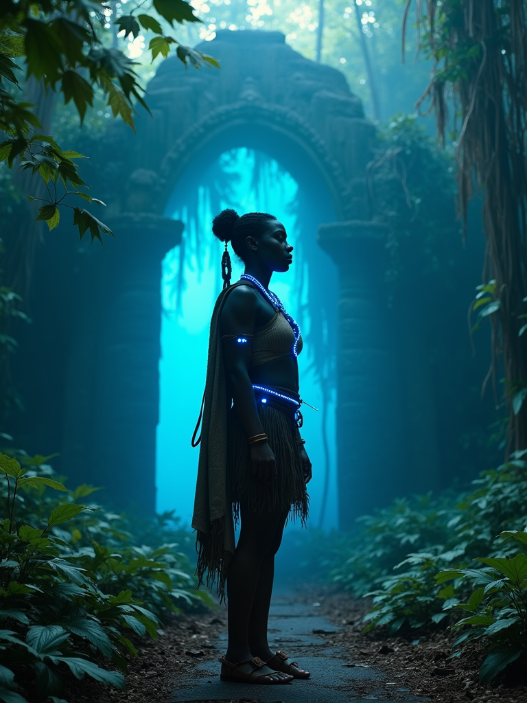 Model standing before an ancient jungle temple glowing with blue energy. Wearing tribal explorer gear, short cloak, glowing necklace . Overgrown ruins, tropical light shafts, mystical vibe.