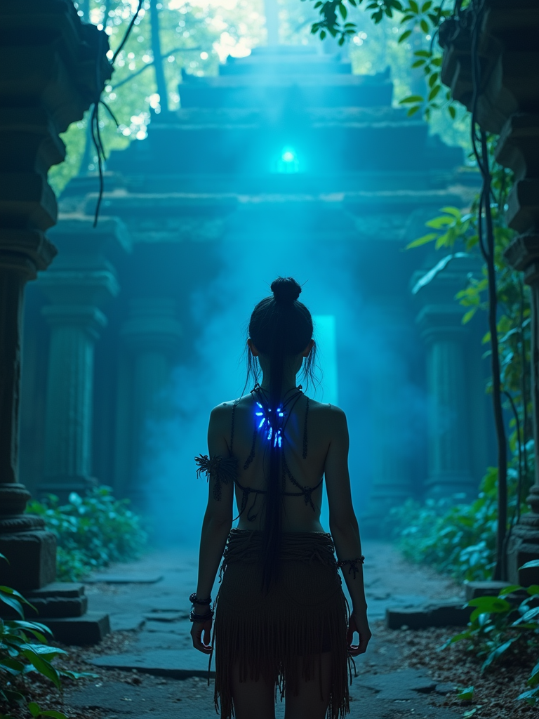 Model standing before an ancient jungle temple glowing with blue energy. Wearing tribal explorer gear, short cloak, glowing necklace . Overgrown ruins, tropical light shafts, mystical vibe.