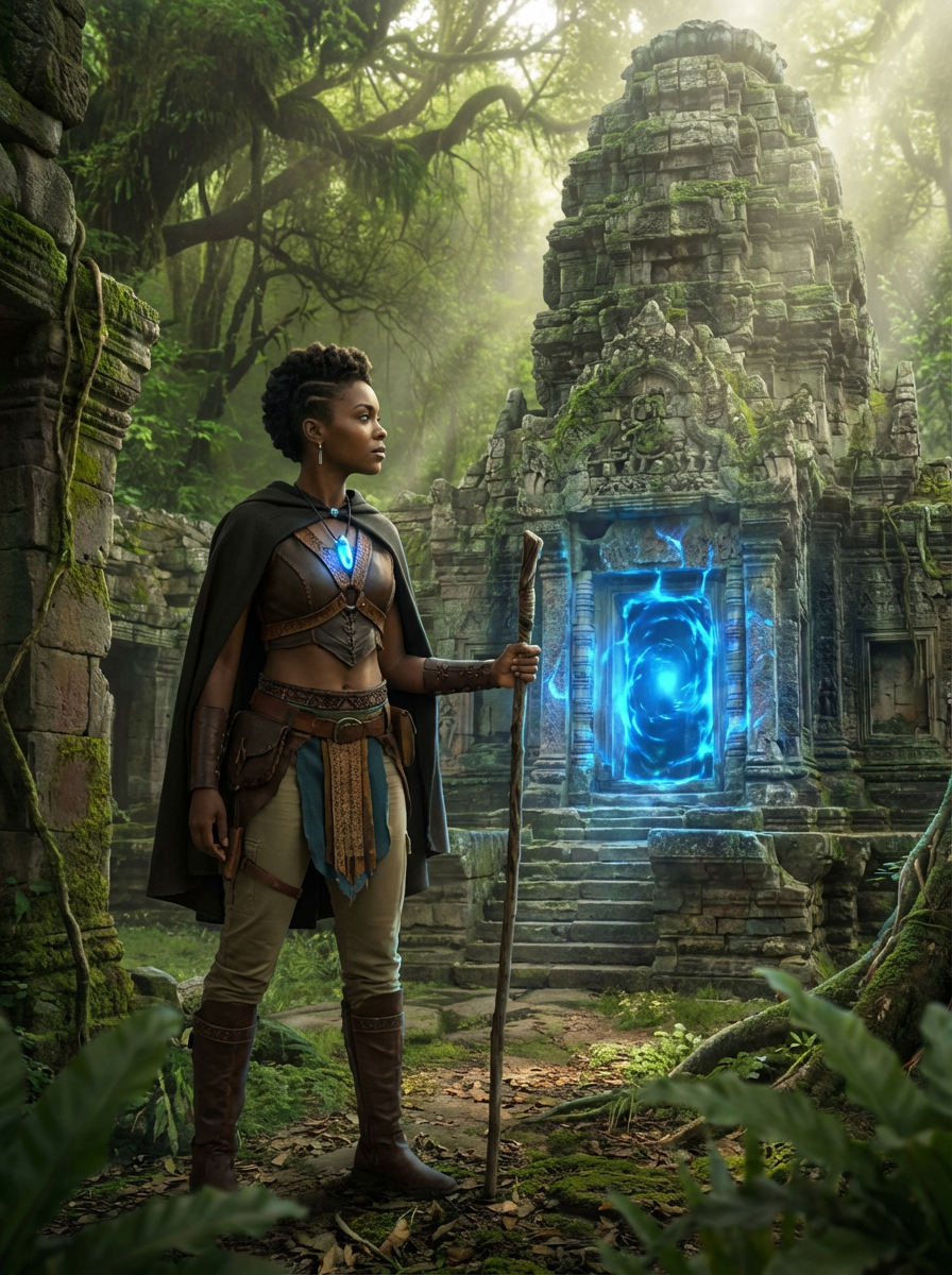 Model standing before an ancient jungle temple glowing with blue energy. Wearing tribal explorer gear, short cloak, glowing necklace . Overgrown ruins, tropical light shafts, mystical vibe.