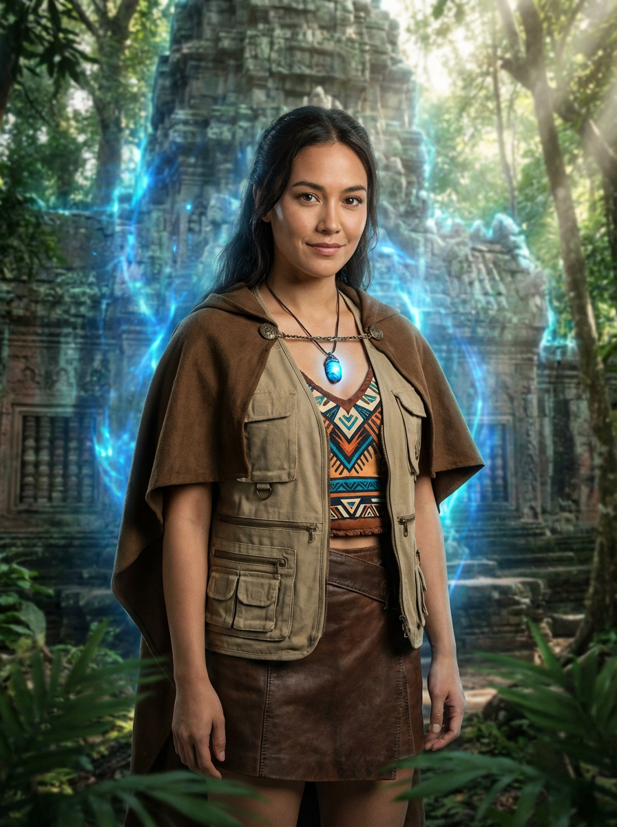 Model standing before an ancient jungle temple glowing with blue energy. Wearing tribal explorer gear, short cloak, glowing necklace . Overgrown ruins, tropical light shafts, mystical vibe.