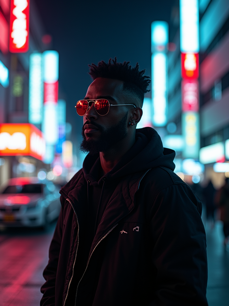 Model standing in neon-lit Tokyo at night, cyberpunk cityscape in the background. Wearing cyberpunk sunglasses, dark streetwear. Dramatic lighting, moody reflections.